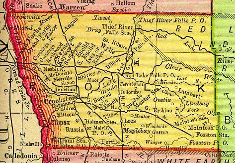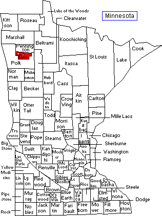 Polk County was established in 1858. Polk County included nearly the entire northwestern corner of Minnesota, representing the present counties of Polk, Norman, Red Lake and Pennington, and parts of Beltrami, Clay, Becker and Hubbard Counties. Its total area covered over 7,000 miles. Gradually legislation diminished the size of the county until nothing remained but the territory now comprising Polk, Red Lake and Pennington Counties. It was still large, in fact ranking fourth in size among all counties in the state. |